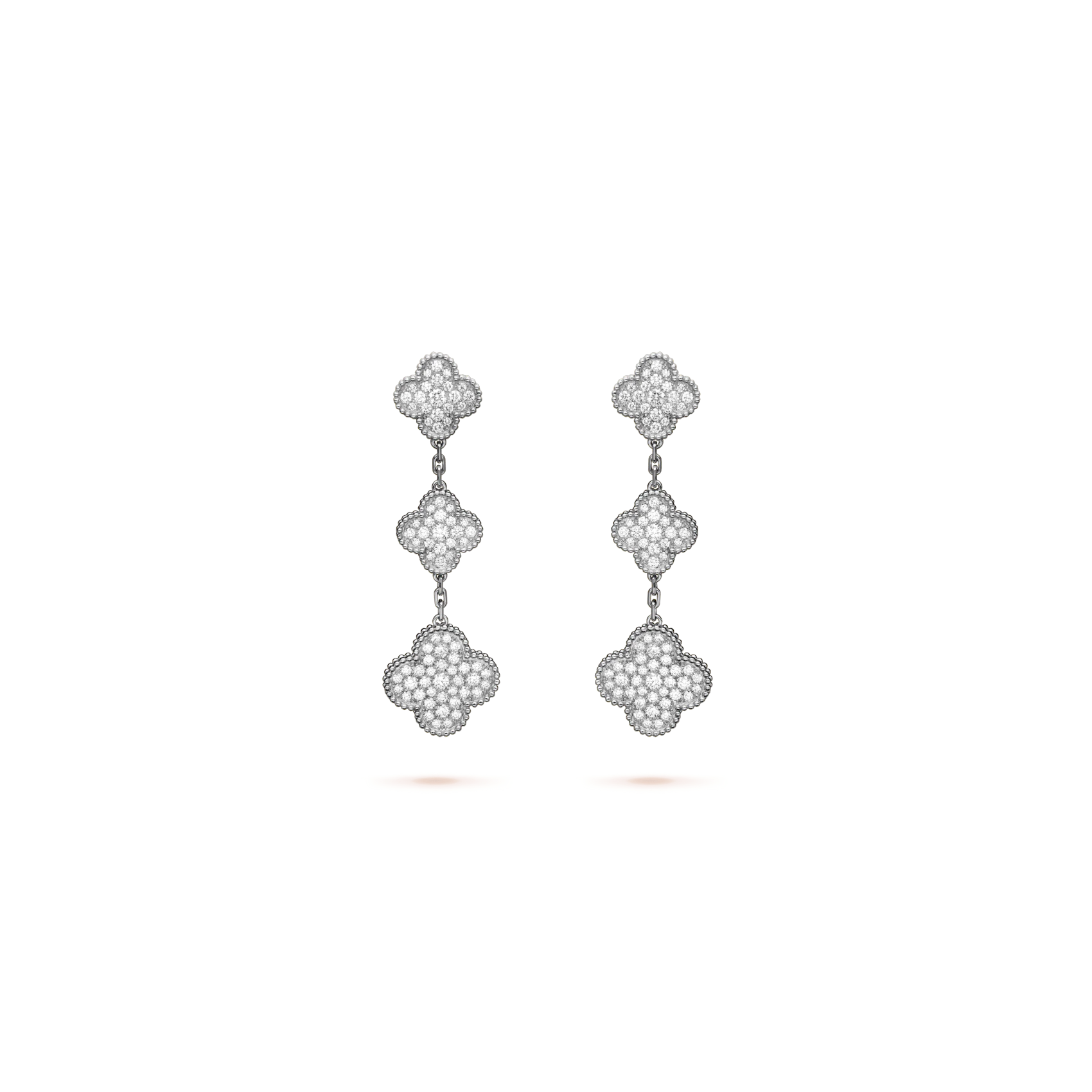 Magic Alhambra earrings, 3 motifs, white gold, round diamonds; diamond quality DEF, IF to VVS.